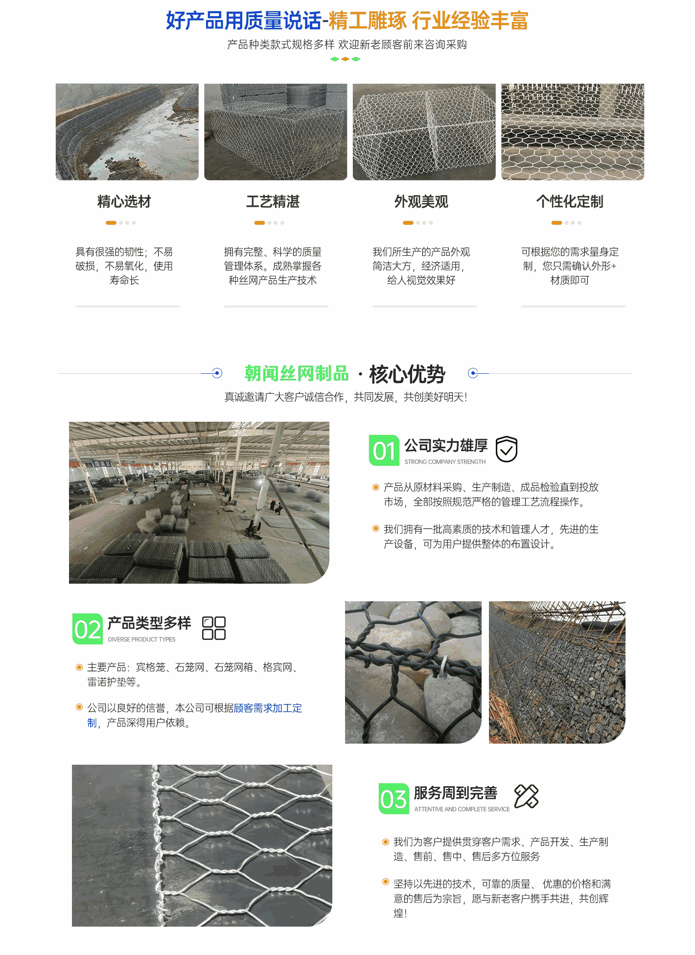 深州市朝聞絲網(wǎng)制品有限公司擁有“中國絲網(wǎng)之鄉(xiāng)”美譽(yù)的河北省致力于生產(chǎn)銷售格賓網(wǎng),雷諾護(hù)墊,景觀石籠網(wǎng),邊坡防護(hù)網(wǎng),綠濱墊,固濱籠的廠家,規(guī)格多種多樣。  我廠堅(jiān)持技術(shù)創(chuàng)新、科學(xué)管理、誠信經(jīng)營,注重引進(jìn)新型生產(chǎn)技術(shù)設(shè)備,推行標(biāo)準(zhǔn)化生產(chǎn),采用質(zhì)量管理體系,從原材料采購、生產(chǎn)管理、產(chǎn)品檢測等關(guān)鍵環(huán)節(jié)嚴(yán)格把關(guān),確保了產(chǎn)品質(zhì)量,贏得了客戶的信賴。我公司秉承“誠信、務(wù)實(shí)、高效”的企業(yè)宗旨,真誠希望與世界各地客戶互惠互利,共創(chuàng)美好未來!多年來"以誠立廠","以質(zhì)興業(yè)"。 憑借過硬的質(zhì)量、良好的信譽(yù)、優(yōu)質(zhì)的服務(wù)、合理的價(jià)格不斷拓展市場,誠摯的希望在平等互利,坦誠相待的基礎(chǔ)上與國內(nèi)外客戶長期合作!...